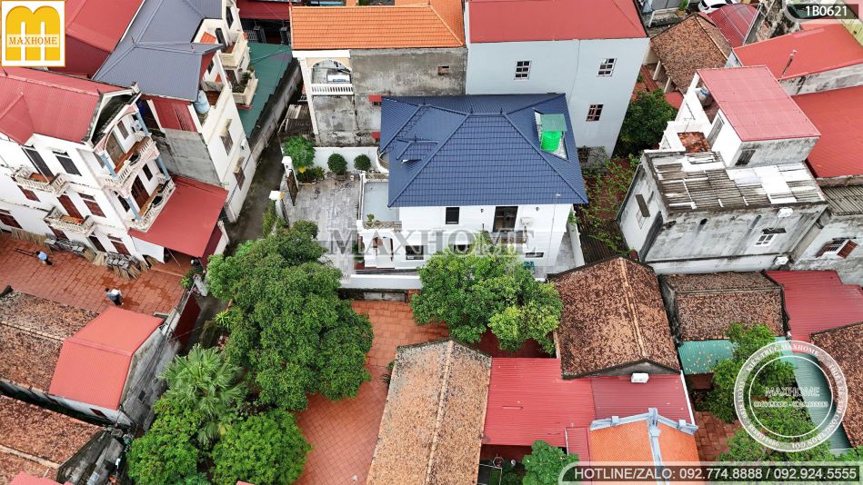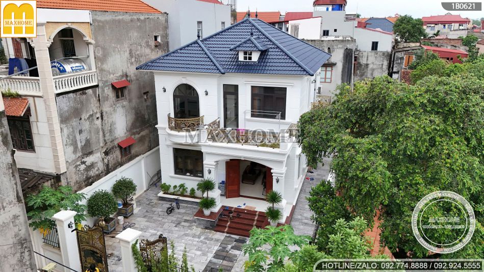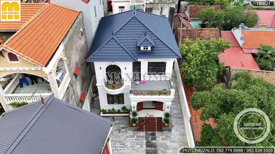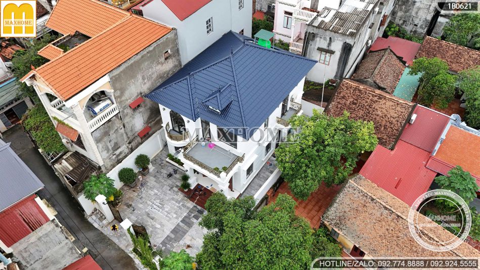 Nhìn từ trên cao, hệ mái Nhật hiện lên đầy uy nghi và đẳng cấp, thể hiện rõ nét vẻ đẹp bề thế của kiến trúc nhà 2 tầng tân cổ điển. Với hình khối mái giật cấp tinh tế, xếp lớp hài hòa và các đường nét dứt khoát, mái ngói màu xanh than không chỉ tạo điểm nhấn thị giác ấn tượng mà còn tôn lên sự vững chãi, kiêu hãnh cho toàn bộ công trình.