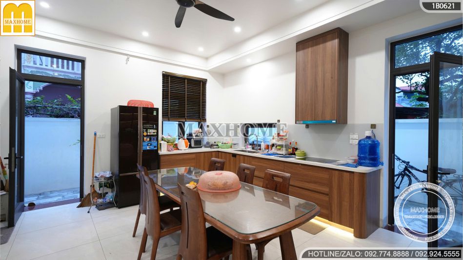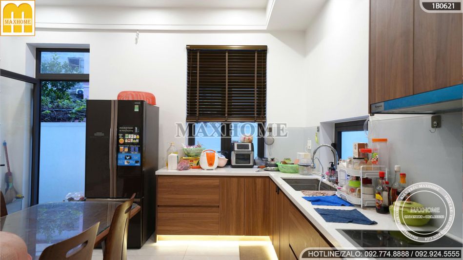Cách bố trí không gian thông minh khi khu vực bếp mở ra sảnh phụ qua ô cửa kính lớn, mang lại sự thông thoáng và tràn ngập ánh sáng tự nhiên. Mọi chi tiết, từ màu sắc, vật liệu đến cách sắp đặt, đều được tính toán kỹ lưỡng để tạo nên một gian bếp hiện đại, tiện nghi nhưng vẫn đậm chất ấm áp của gia đình.