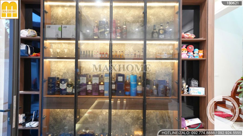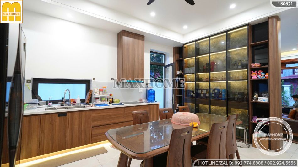 Hệ tủ bếp được thiết kế gọn gàng với các mảng gỗ vân tự nhiên, bề mặt phẳng mịn, mang lại cảm giác thanh lịch và tinh tế. Bên cạnh đó, kệ tủ trưng bày có cửa kính trong và hệ đèn LED âm sáng vàng là điểm nhấn nổi bật. Ánh sáng hắt nhẹ tôn lên những chai rượu, ly pha lê, và đồ trang trí bên trong, tạo nên cảm giác sang trọng.