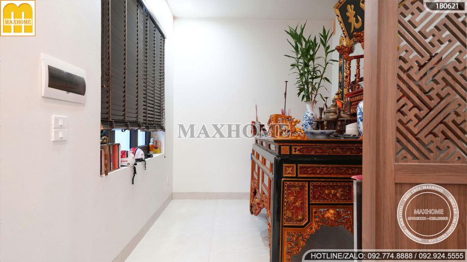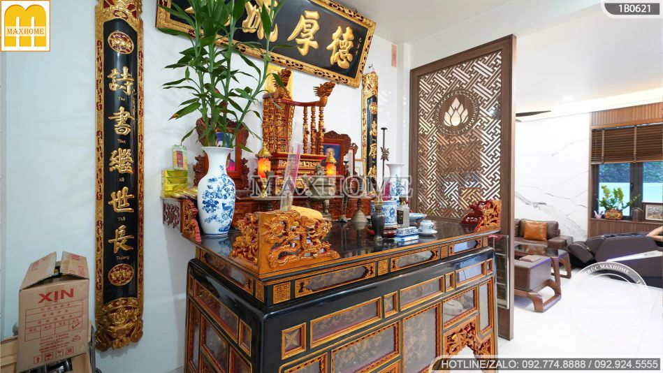 Phòng thờ được bố trí trang trọng tại tầng 1, vừa thuận tiện cho việc thờ cúng vừa thể hiện sự tôn kính với tổ tiên. Bàn thờ được chế tác tinh xảo từ gỗ tự nhiên sơn son thếp vàng, chạm khắc hoa văn rồng phượng cầu kỳ, mang đậm nét truyền thống Á Đông. Trên bàn thờ, các vật phẩm thờ tự như bát hương, đèn thờ, lọ lộc bình men lam và hoành phi câu đối sơn son tạo nên một không gian linh thiêng, ấm cúng và tràn đầy sinh khí.