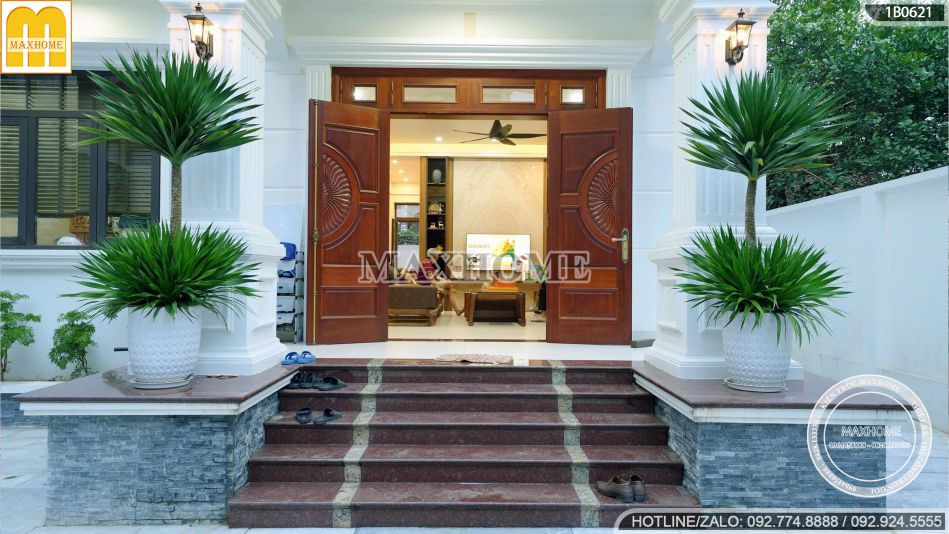 Hệ bậc tam cấp được thiết kế cân đối, sử dụng đá granite màu nâu đỏ điểm xuyết những đường chỉ sáng tạo nên vẻ sang trọng và bề thế ngay từ lối vào. Bề mặt đá bóng mịn, chống trơn trượt, vừa đảm bảo an toàn khi di chuyển, vừa giúp tổng thể mặt tiền thêm phần đẳng cấp.
