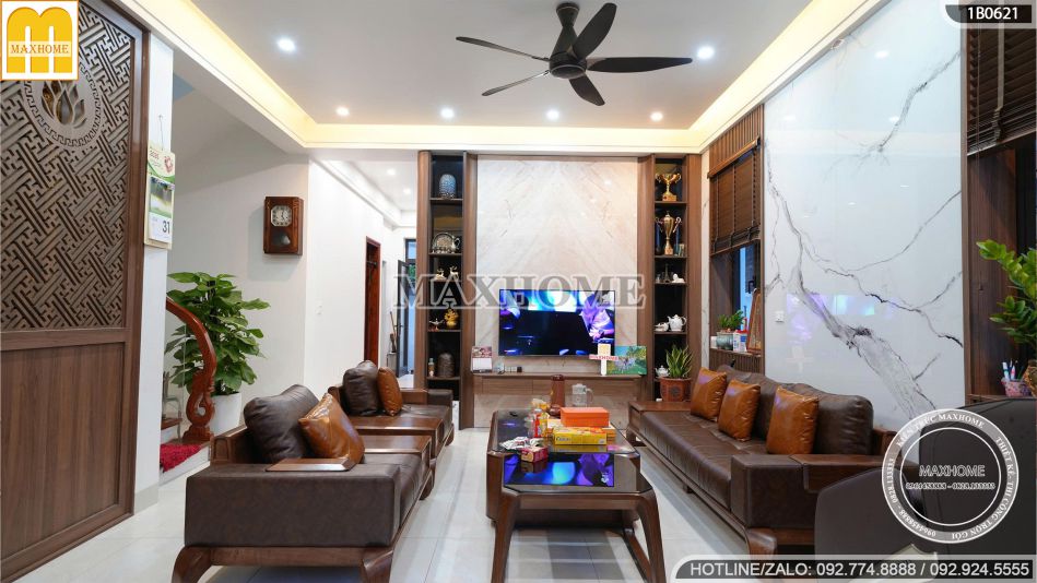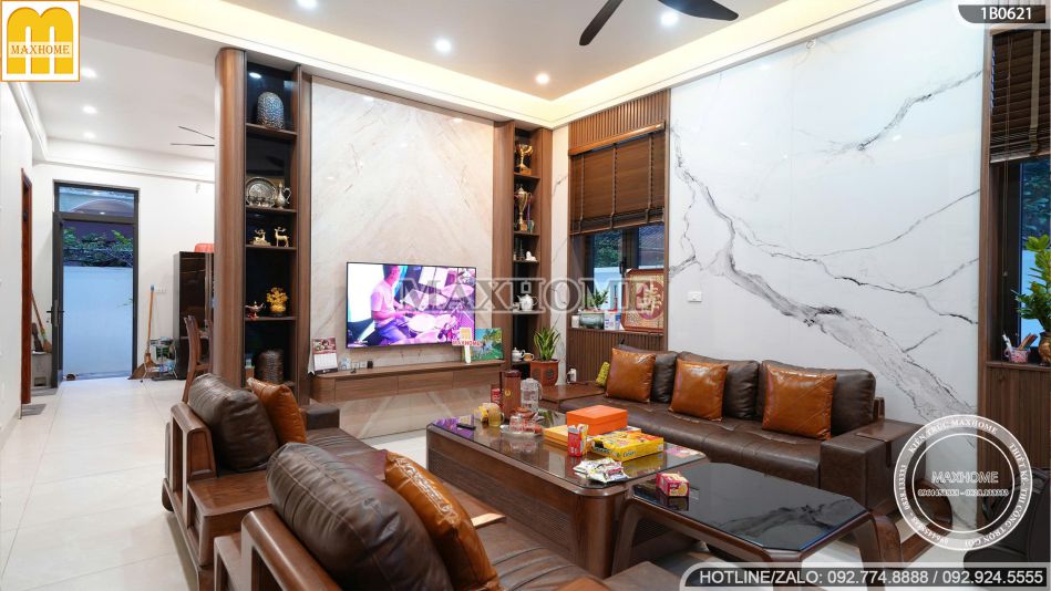 Không gian phòng khách toát lên vẻ sang trọng và ấm cúng nhờ sự kết hợp hài hòa giữa chất liệu, màu sắc và cách bố trí nội thất tinh tế. Bộ sofa gỗ cao cấp bọc da nâu mang đến cảm giác vững chãi, sang trọng, đồng thời hòa quyện hoàn hảo với bàn trà mặt kính bóng sáng, tạo điểm nhấn hiện đại giữa không gian.