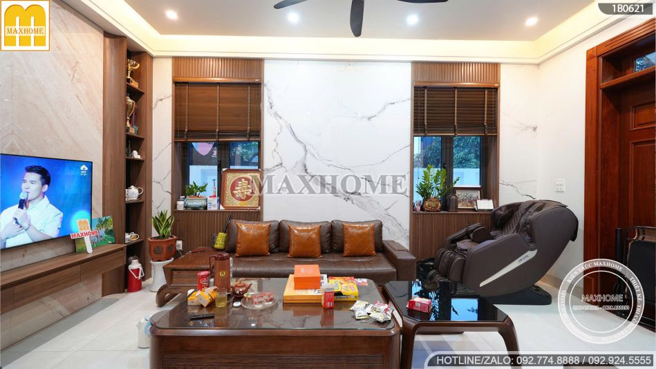 Bức tường phía sau tivi được ốp đá vân mây kết hợp hệ tủ âm tường trang trí tinh xảo, giúp tăng chiều sâu và nét thẩm mỹ cho căn phòng. Ánh sáng vàng dịu cùng hệ cửa sổ rộng mở, sử dụng rèm gỗ tối màu, vừa đảm bảo sự riêng tư vừa đón sáng tự nhiên, khiến căn phòng luôn thông thoáng, gần gũi mà vẫn đậm chất quý phái của một không gian sống đẳng cấp.