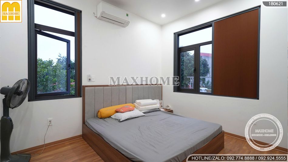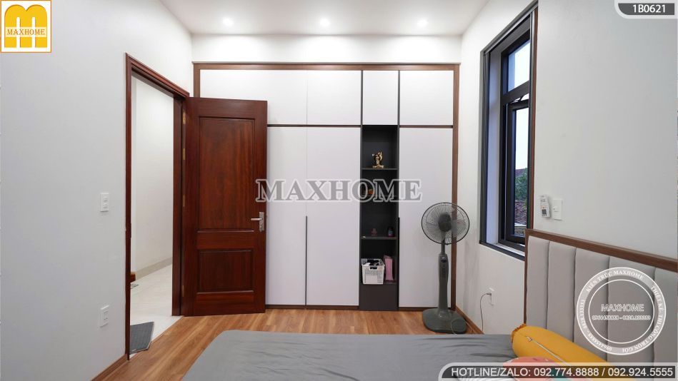 Phòng ngủ được thiết kế tối giản, tinh tế nhưng vẫn toát lên vẻ sang trọng nhờ sự kết hợp hài hòa giữa gam trắng thanh nhã và sắc nâu gỗ ấm áp. Chiếc giường với phần đầu giường bọc nệm mềm mại, cùng bộ ga gối tông màu trung tính, mang lại cảm giác thư giãn và êm ái tuyệt đối.
