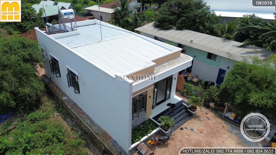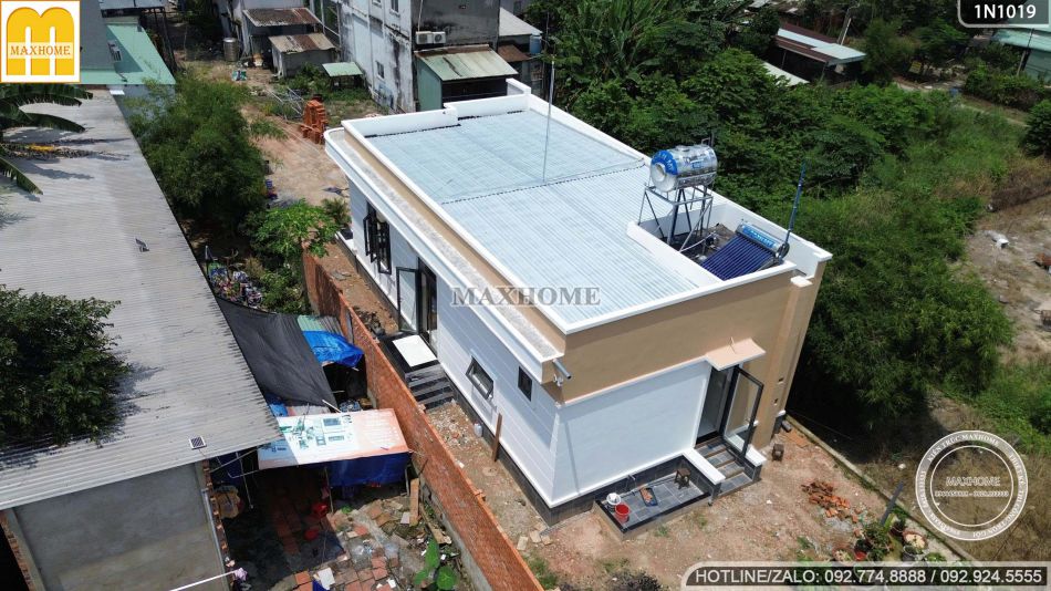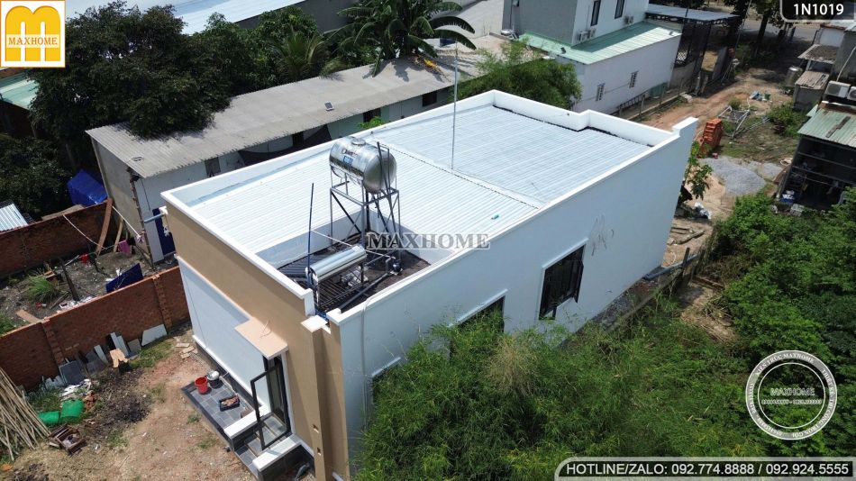 Ngôi nhà 1 tầng hiện đại được thiết kế với hệ mái bằng chắc chắn, phía trên còn được lợp thêm một lớp tôn giúp tăng khả năng chống nóng và bảo vệ công trình bền bỉ hơn trước tác động của thời tiết. Ngoài ra, dọc theo viền mái, kiến trúc sư còn bố trí hệ thống ống thoát nước được tính toán kỹ lưỡng, giúp thoát nước nhanh chóng trong những ngày mưa lớn, đảm bảo công trình luôn khô ráo và bền đẹp theo thời gian.