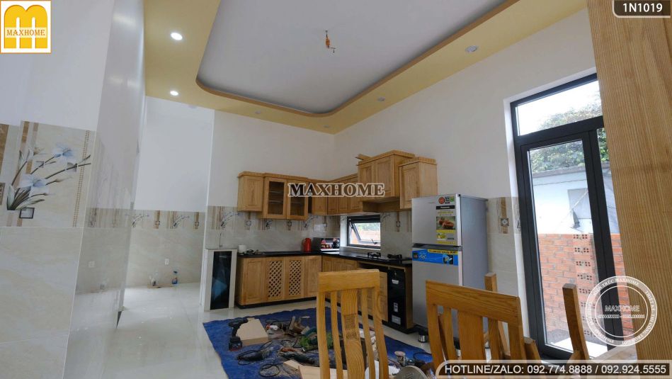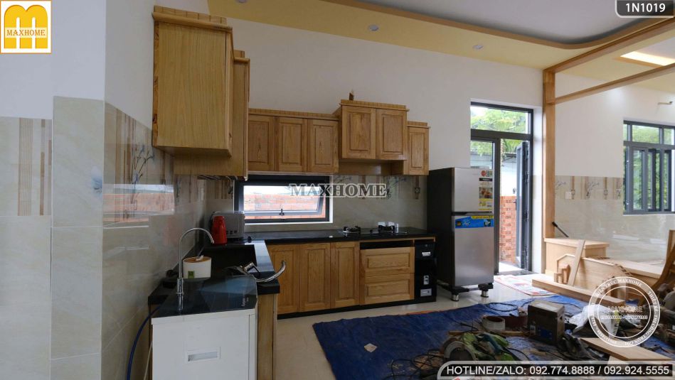Tiếp theo là không gian phòng bếp ăn của nhà 1 tầng hiện đại, được thiết kế tiện nghi với hệ tủ bếp hình chữ L bằng chất liệu gỗ tự nhiên cao cấp, vừa bền đẹp vừa mang lại cảm giác ấm cúng. Khu vực này đã được hoàn thiện lắp đặt đầy đủ, đảm bảo tối ưu công năng sử dụng và tạo sự thuận tiện trong quá trình nấu nướng.