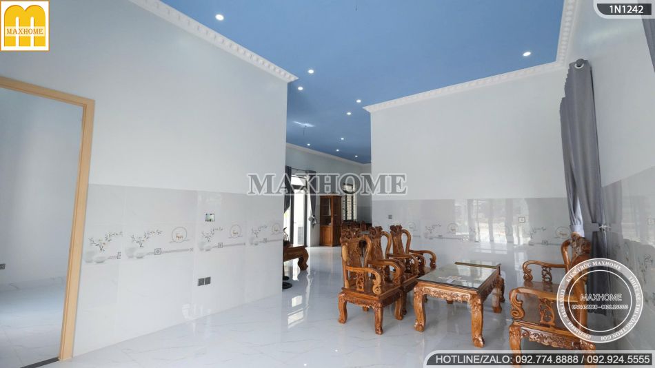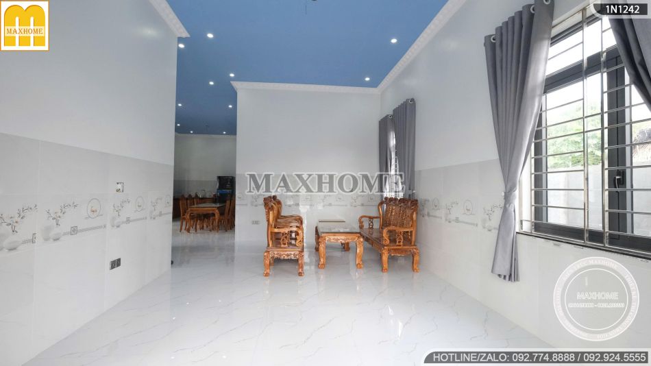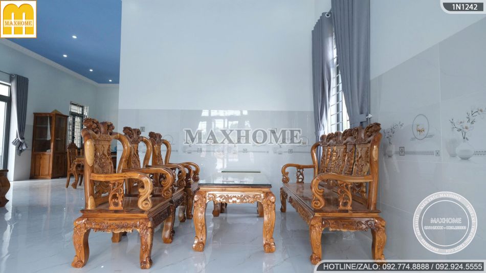 Không gian phòng khách mang vẻ đẹp thanh thoát và sang trọng, thể hiện rõ gu thẩm mỹ tinh tế của gia chủ. Bộ bàn ghế gỗ chạm khắc cầu kỳ trở thành điểm nhấn nổi bật giữa nền sàn trắng bóng và tường ốp gạch sáng, tạo nên sự tương phản hài hòa giữa nét truyền thống và hiện đại.