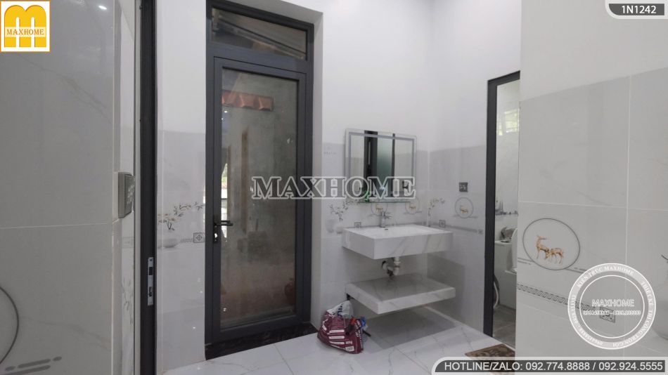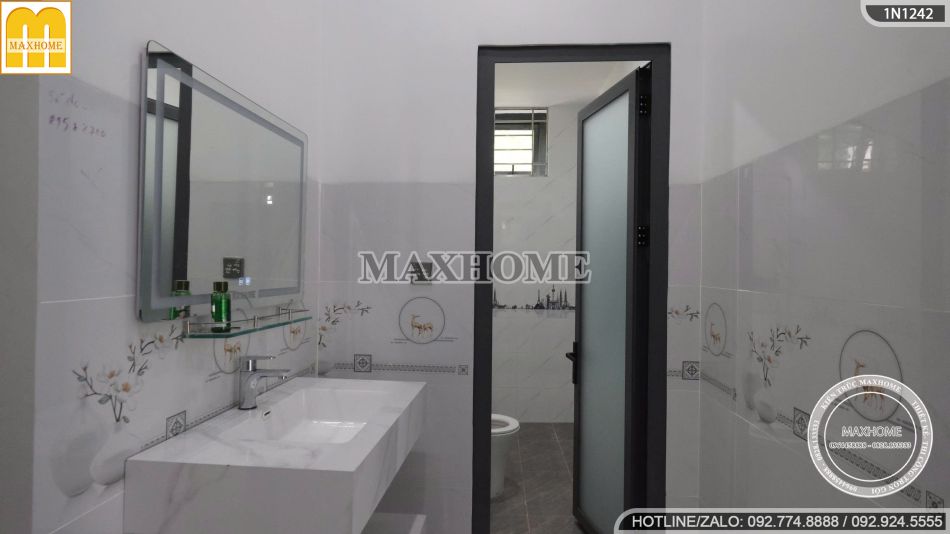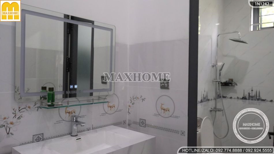 Nhà vệ sinh hiện đại, sang trọng và đầy tinh tế, với tông trắng chủ đạo mang lại cảm giác rộng thoáng và sạch sẽ. Điểm nhấn ấn tượng đến từ gạch ốp tường vân nhẹ, bồn rửa đá nhân tạo vân mây cao cấp cùng gương đèn LED cảm ứng thông minh thương hiệu Maxhome, vừa thẩm mỹ vừa tiện lợi trong sử dụng.