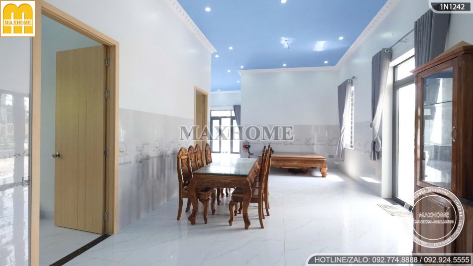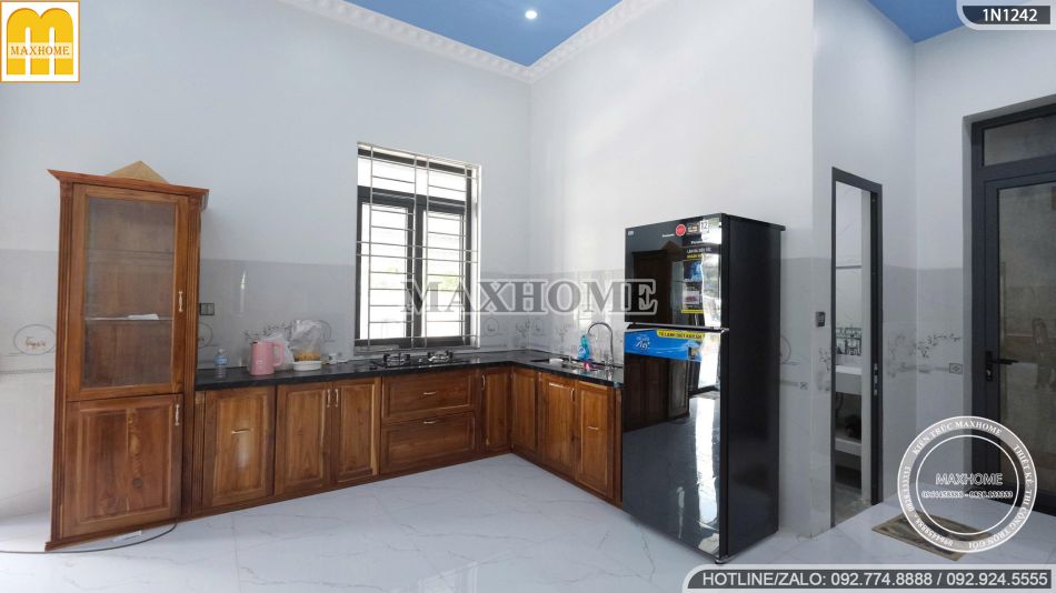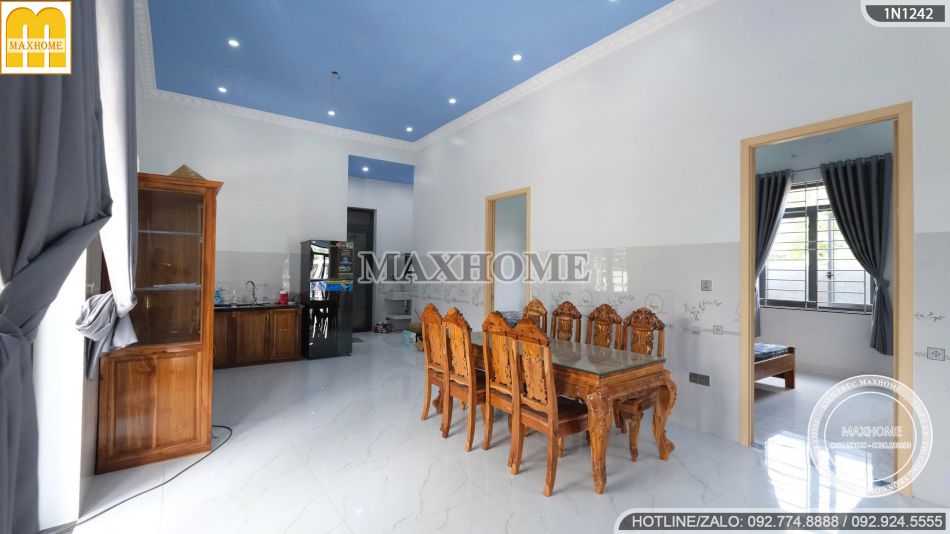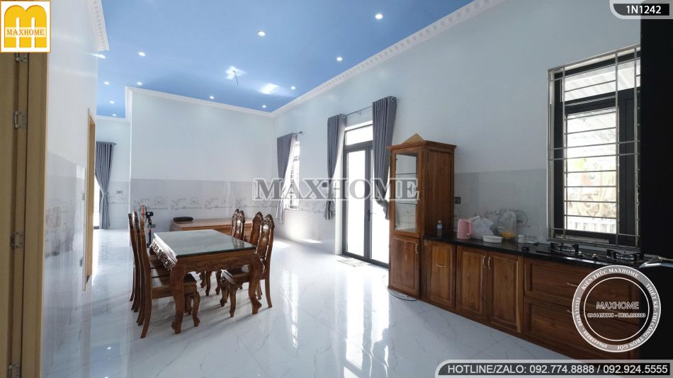 Phòng bếp mở ra phía sảnh phụ giúp gió mát và ánh sáng tự nhiên tràn ngập vào bên trong, mang đến cảm giác thoáng đãng, dễ chịu. Bộ bàn ăn gỗ chạm khắc tinh xảo là điểm nhấn hoàn hảo, góp phần tôn lên nét sang trọng và chỉn chu trong tổng thể không gian bếp – nơi lưu giữ những bữa cơm ấm áp và gắn kết yêu thương của gia đình.