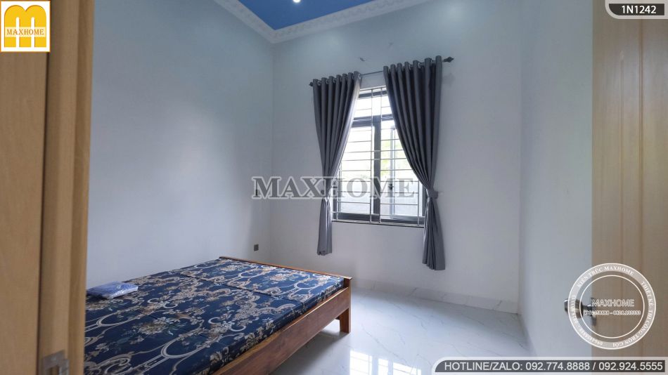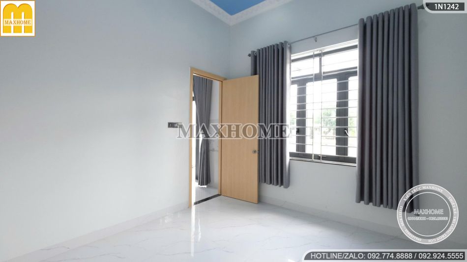 Màu trần xanh dịu mắt kết hợp hệ đèn LED âm trần tinh tế giúp không gian thêm cao ráo, thoáng đãng. Cửa sổ kính lớn khung nhôm cùng rèm xám nhẹ cho phép ánh sáng tự nhiên lan tỏa khắp căn phòng, mang lại cảm giác ấm cúng mà vẫn giữ được nét sang trọng, tinh khôi đặc trưng của phong cách nhà vườn hiện đại mái Nhật.