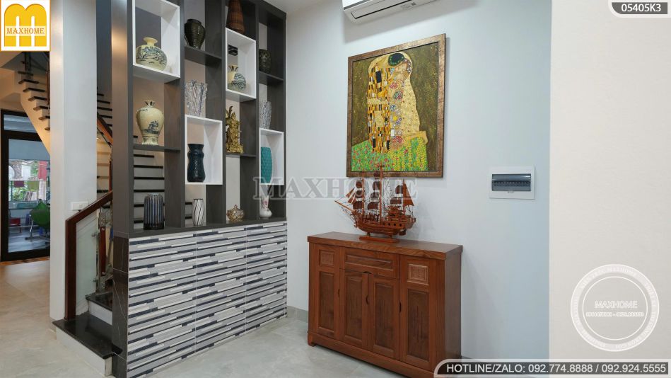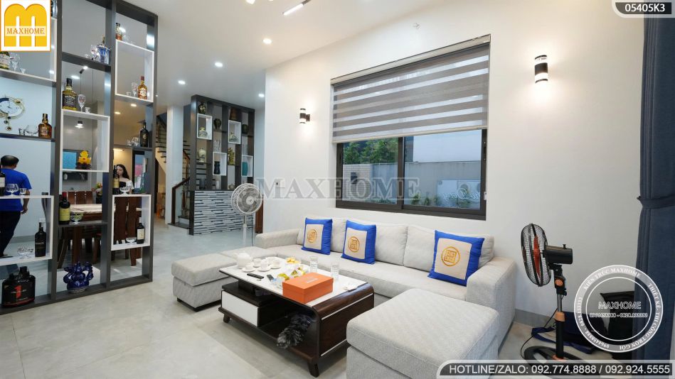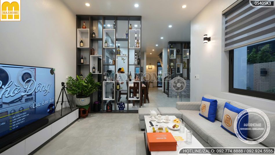 Kệ trưng bày thiết kế mở, bố trí rượu vang và đồ trang trí tinh xảo, không chỉ ngăn cách nhẹ nhàng giữa phòng khách và phòng ăn mà còn tăng chiều sâu cho không gian. Mỗi chi tiết từ mặt bàn trà bày biện gọn gàng, đến cửa sổ lớn đón sáng tự nhiên đều được chăm chút kỹ lưỡng, thể hiện gu thẩm mỹ tinh tế của gia chủ. Đây không chỉ là nơi tiếp khách, mà còn là “trái tim” của ngôi nhà, nơi phong cách và sự tiện nghi hòa quyện, khẳng định vị thế và đẳng cấp sống vượt trội.