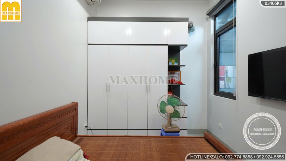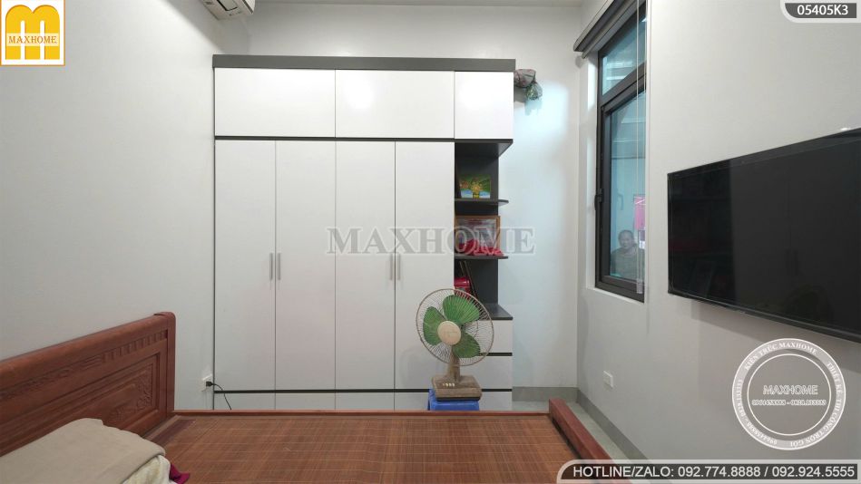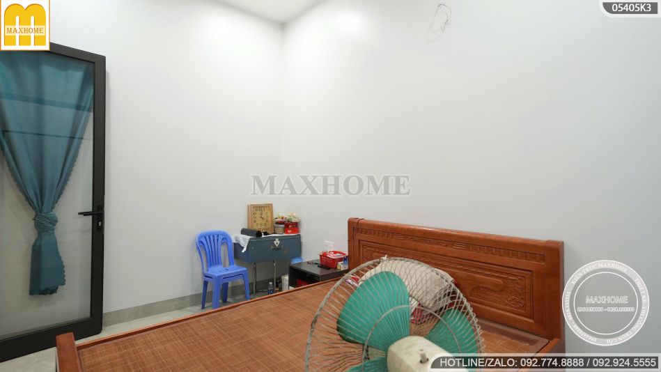 Phòng ngủ của ông bà được bố trí ngay tại tầng 1 với thiết kế đơn giản, gọn gàng nhưng vẫn đảm bảo đầy đủ tiện nghi cần thiết. Không gian sử dụng gam màu sáng nhẹ nhàng, mang đến cảm giác ấm cúng và dễ chịu cho người lớn tuổi. Đặc biệt, nhà vệ sinh ngay bênh cạnh, giúp ông bà thuận tiện hơn trong sinh hoạt hằng ngày, nhất là vào ban đêm, đảm bảo an toàn và thoải mái tối đa.