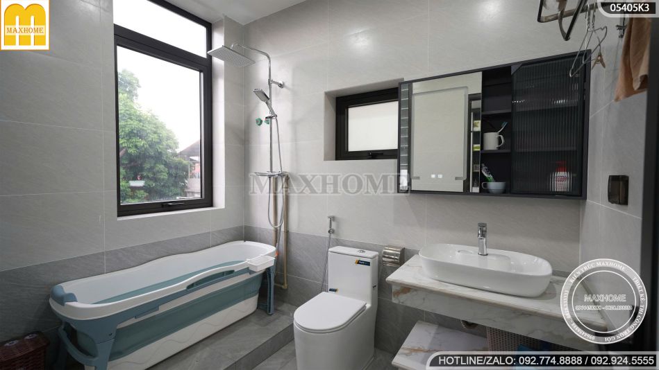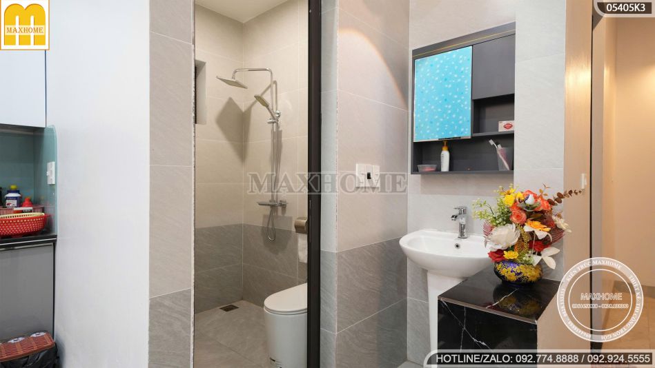 Phòng vệ sinh khép kín với gam màu sáng và nội thất cao cấp, mang lại cảm giác sạch sẽ, tinh tế. Việc bố trí WC ngay trong phòng ngủ giúp gia chủ thuận tiện sinh hoạt, đảm bảo sự riêng tư và nâng cao trải nghiệm sống tiện nghi mỗi ngày.