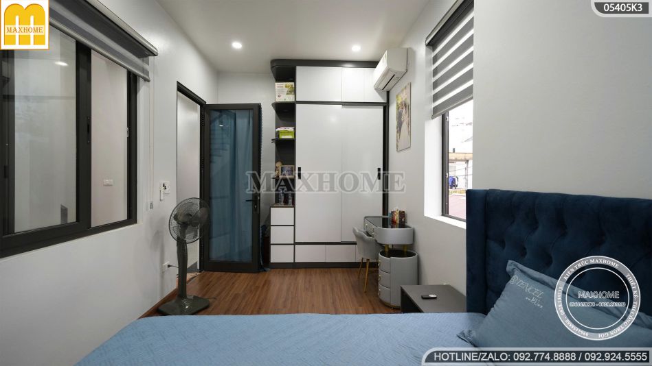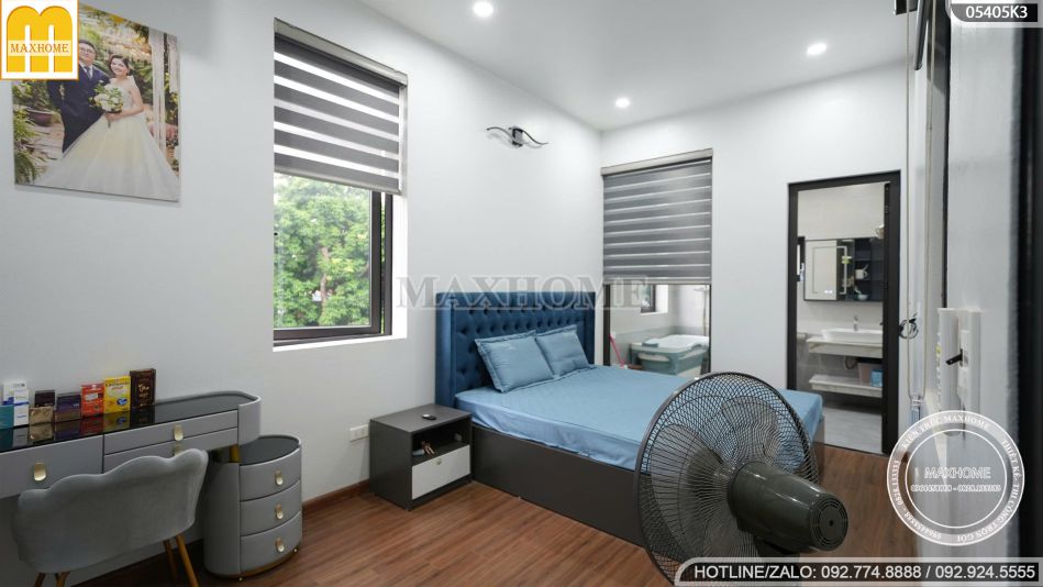 Phòng ngủ được thiết kế tinh giản nhưng vẫn toát lên vẻ sang trọng và ấm cúng. Gam màu xanh phối xám nhẹ nhàng cùng ánh sáng tự nhiên từ cửa sổ lớn tạo nên không gian thư giãn lý tưởng, giúp gia chủ dễ dàng tận hưởng giấc ngủ trọn vẹn. Nội thất được sắp xếp gọn gàng, tinh tế với giường bọc nệm cao cấp và bàn trang điểm thời thượng, thể hiện gu thẩm mỹ thanh lịch và tinh tế của người sở hữu.