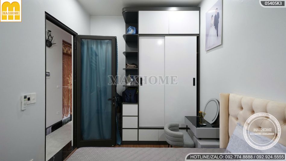 Phòng ngủ này được thiết kế tối giản nhưng vẫn toát lên nét tinh tế và sang trọng với gam màu trung tính nhẹ nhàng. Tủ đồ cao kịch trần, giường bọc nệm êm ái kết hợp cùng bàn trang điểm nhỏ gọn tạo nên không gian tiện nghi và nghỉ ngơi ấm cúng, thư thái cho gia chủ.