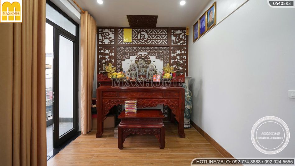 Phòng thờ được đặt ở vị trí trang trọng trên tầng 2, hài hòa về phong thủy, nhằm đảm bảo sự cân bằng năng lượng trong không gian sống. Bàn thờ làm từ gỗ tự nhiên cao cấp, toát lên vẻ sang trọng nhưng vẫn giữ được nét văn hóa tâm linh truyền thống của người Việt.