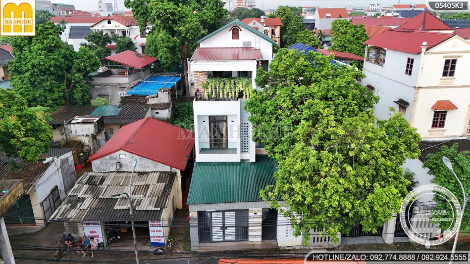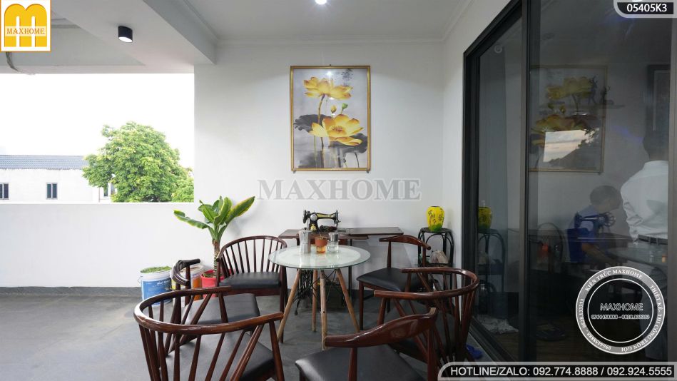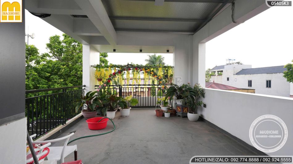 Những chậu hoa nhỏ xinh được bố trí hài hòa trên góc ban công tầng 3 tạo nên không gian sống trong lành, tươi mát. Màu xanh thiên nhiên không chỉ giúp cân bằng kiến trúc mà còn mang lại cảm giác thư thái, dễ chịu cho các thành viên trong gia đình. Nhờ vậy, ngôi nhà luôn tràn đầy sức sống, trở thành nơi lý tưởng để tận hưởng sự bình yên mỗi ngày.