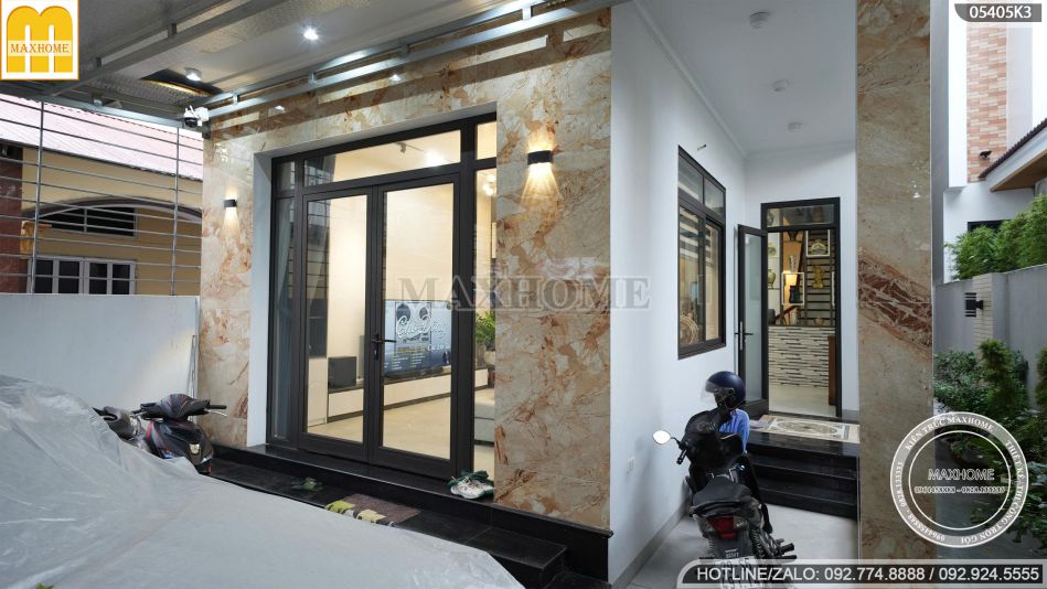 Mang đặc trưng của kiến trúc hiện đại, ngôi nhà phố 3 tầng sử dụng chất liệu nhôm hệ xingfa kính cường lực một cách tối ưu trong thiết kế các hệ cửa. Điều này không chỉ giúp tăng cường khả năng đón gió và ánh sáng tự nhiên, mà còn tạo sự kết nối hài hòa giữa con người với thiên nhiên.