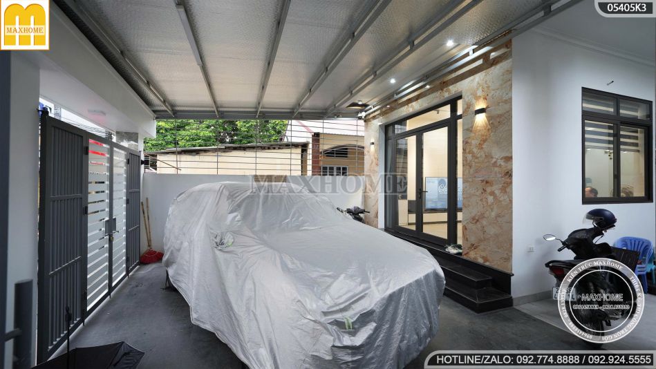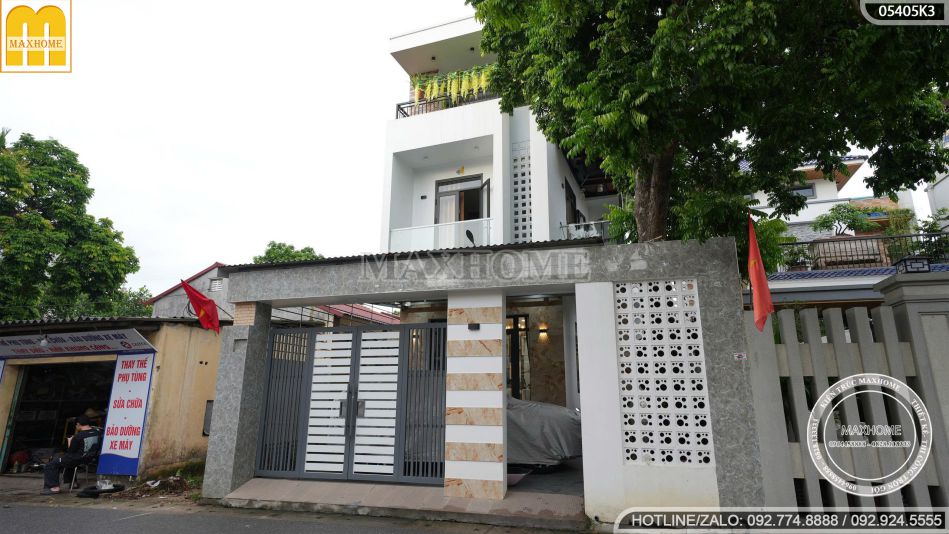 Ngôi nhà gây ấn tượng mạnh với những đường nét kiến trúc sắc sảo và hình khối vững chãi, tạo nên diện mạo hiện đại, khỏe khoắn và cuốn hút. Các mảng tường, khung cửa và chi tiết trang trí được phối hợp nhịp nhàng, cùng gam màu tinh tế giúp tổng thể công trình trở nên cân đối và đầy tính thẩm mỹ.