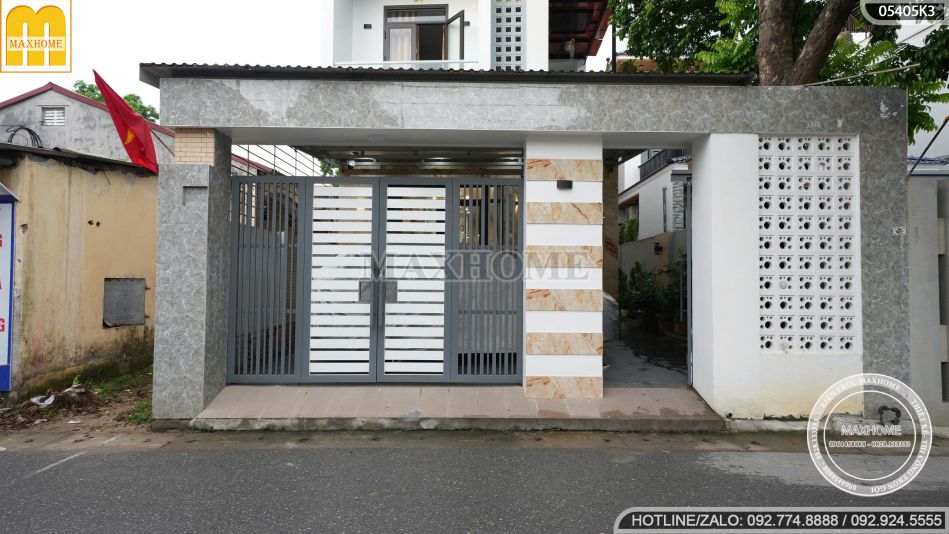 Hệ thống cổng và tường bao hiện đại mang đến tổng thể hài hòa, tinh tế và bền vững theo thời gian. Cổng chính sử dụng khung thép hộp sơn ghi xám kết hợp các nan gỗ trắng, tạo điểm nhấn sang trọng và cuốn hút.