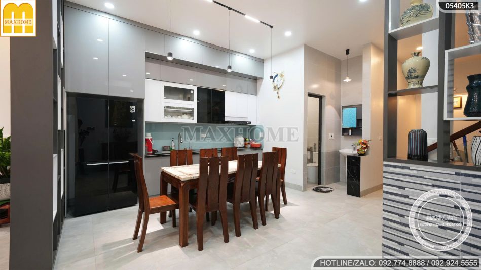 Không gian phòng bếp mang đậm hơi thở hiện đại với thiết kế tinh gọn và sang trọng. Tông màu xám – trắng chủ đạo kết hợp cùng hệ tủ bếp acrylic bóng gương giúp mở rộng không gian và tạo cảm giác sạch sẽ, đẳng cấp. Bộ bàn ăn ghế gỗ tự nhiên, bàn mặt đá đặt giữa trung tâm vừa ấm cúng vừa nổi bật, trở thành điểm nhấn hoàn hảo cho căn bếp tiện nghi và đầy sức sống.