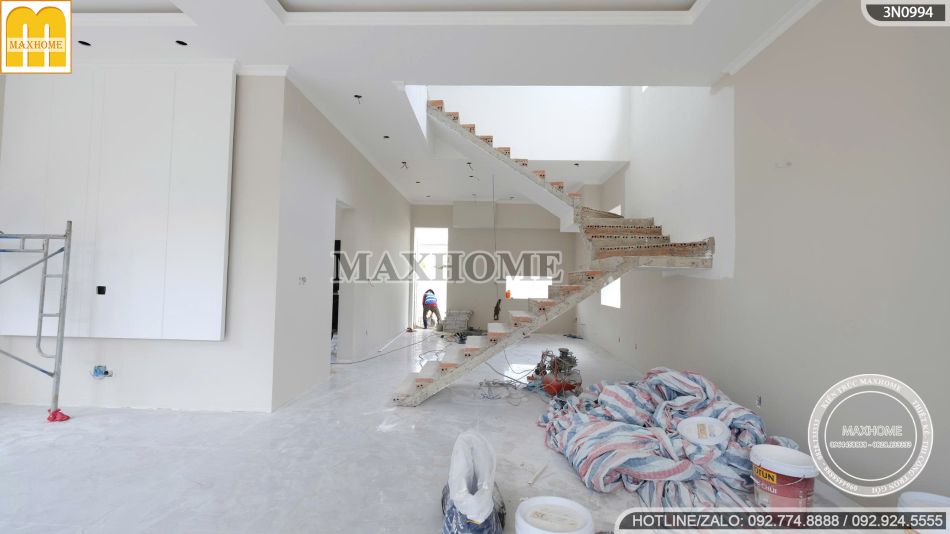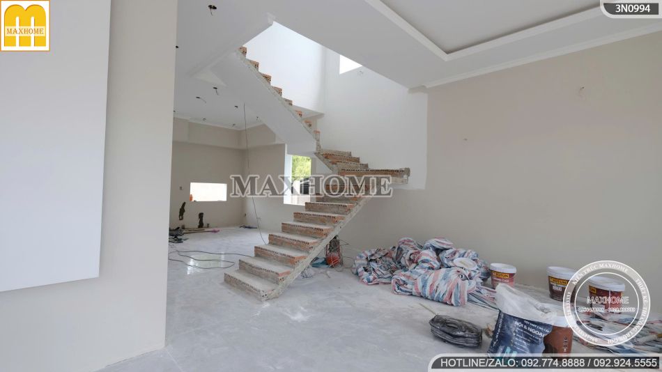 Không gian phòng khách đang dần hiện rõ vẻ sang trọng với hệ cầu thang bê tông đang trong giai đoạn hoàn thiện, chuẩn bị được ốp lát và trang trí để tạo điểm nhấn kiến trúc hiện đại.