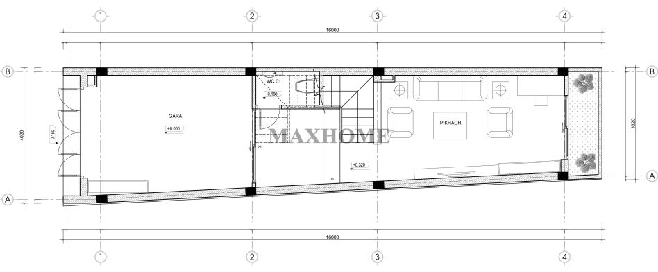• Tầng 1: Gara xe, phòng khách, 1 wc