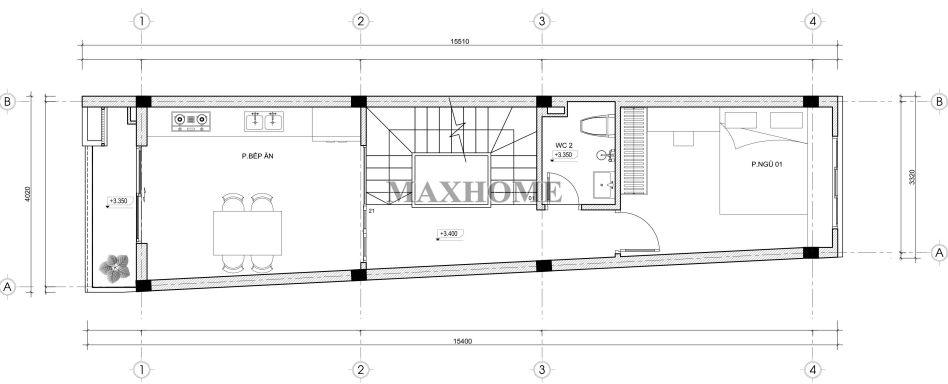 Tầng 2 được bố trí không gian bếp và phòng ăn thông thoáng, thuận tiện cho sinh hoạt hằng ngày của gia đình. Ở cuối nhà là một phòng ngủ có diện tích vừa phải, đảm bảo sự yên tĩnh và riêng tư. Bên cạnh đó, tầng này còn có một nhà vệ sinh chung đặt liền kề, giúp tối ưu hóa công năng và mang lại sự tiện lợi cho việc sử dụng.