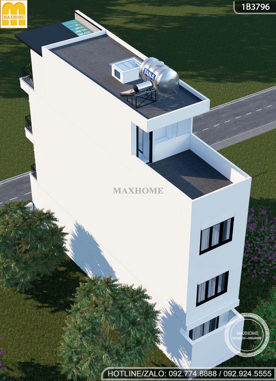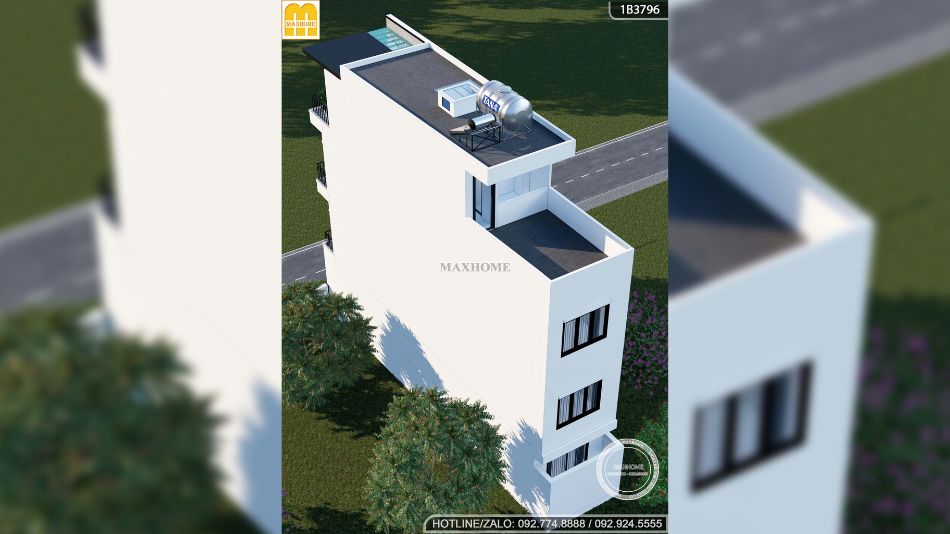 Nhà phố được thiết kế với mái bằng, phù hợp với nhiều phong cách kiến trúc đô thị hiện nay. Chúng tôi đã bố trí hệ thống thoát nước từ mái xuống một cách khoa học, đảm bảo hiệu quả chống thấm và ngăn ngừa ứ đọng nước. Bên cạnh đó, ngôi nhà 4 tầng còn được trang bị hệ thống giếng trời, giúp không gian bên trong luôn thông thoáng, tràn đầy ánh sáng tự nhiên và tạo sự kết nối hài hòa với môi trường bên ngoài.