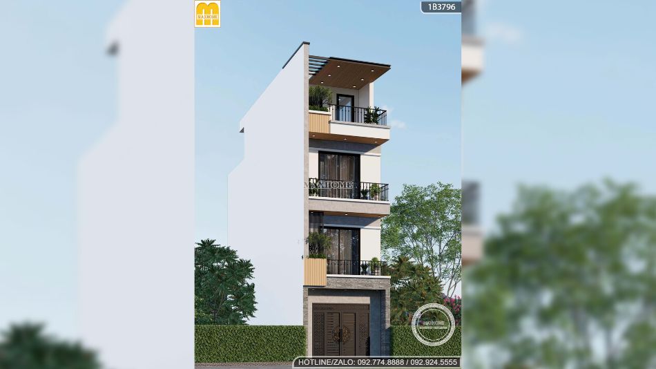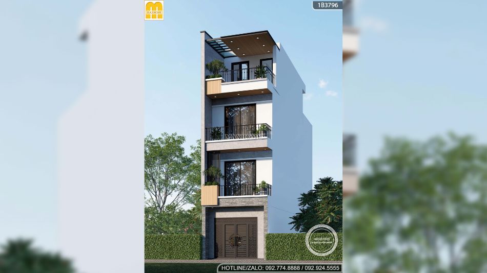 Điểm nhấn đầu tiên của mẫu nhà phố 4 tầng nằm ở phong cách kiến trúc hình khối hiện đại, được tạo nên từ những mảng khối vuông vức, mạnh mẽ. Công trình không sử dụng quá nhiều chi tiết trang trí cầu kỳ mà ưu tiên sự tối giản tinh tế. Gam màu trắng tinh khôi được chọn làm chủ đạo, kết hợp hài hòa với các vật liệu ốp trang trí như đá chẻ, gạch giả gỗ và gạch granite. Sự phối hợp này không chỉ mang lại vẻ đẹp sang trọng, khỏe khoắn mà còn giúp mặt tiền công trình trở nên bền bỉ và nổi bật theo thời gian.