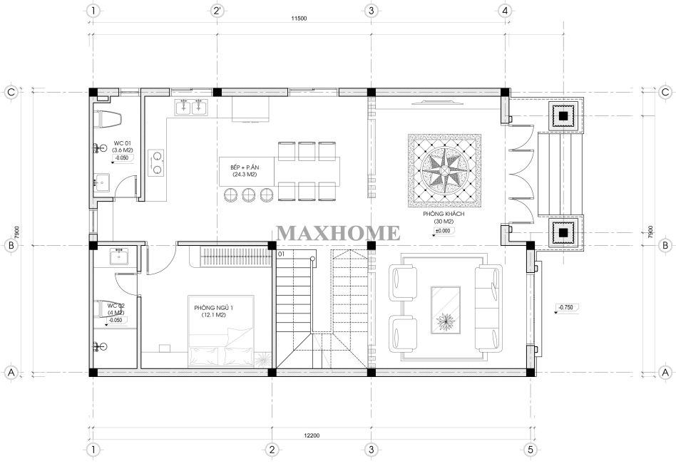 Từ sảnh chính bước vào là khu vực sảnh đệm thoáng đãng, tạo điểm chuyển tiếp nhẹ nhàng trước khi vào không gian sinh hoạt. Phòng khách được bố trí bên tay phải, rộng rãi và đón sáng tốt, là nơi gia đình tiếp khách và quây quần mỗi ngày.