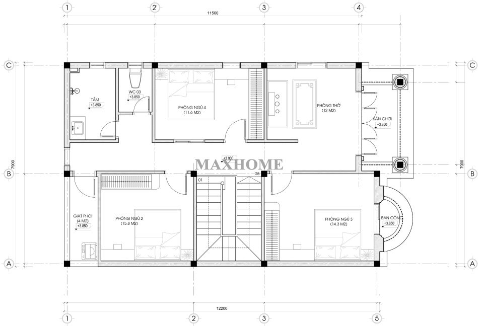 Tầng 2 được bố trí một phòng thờ trang nghiêm ở vị trí hợp phong thủy, đảm bảo sự yên tĩnh và tôn nghiêm cần có. Xung quanh là 3 phòng ngủ được sắp xếp khoa học, mang lại sự riêng tư và thoải mái cho từng thành viên trong gia đình. Ngoài ra, tầng 2 còn có một nhà vệ sinh chung kết hợp phòng tắm tiện nghi, đáp ứng nhu cầu sinh hoạt hằng ngày. Khu vực giặt và phơi được đặt ở cuối nhà, tách biệt với các không gian khác, giúp việc sinh hoạt trở nên thuận lợi và gọn gàng hơn.