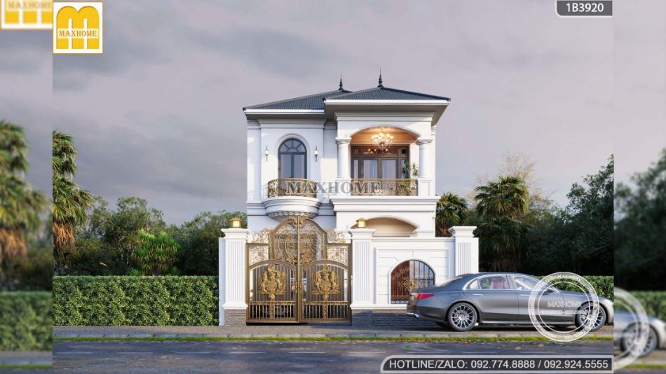Lan can ban công được làm từ sắt mỹ thuật sơn màu nan đồng, tạo cảm giác sang trọng và đồng bộ với phong cách tân cổ điển của ngôi nhà. Ở khu vực cửa sổ tầng 2, kiến trúc sư thiết kế các vòm cong mềm mại kết hợp với ban công hình bán nguyệt – những chi tiết đặc trưng thường thấy ở các mẫu nhà tân cổ điển. Sự kết hợp này không chỉ gia tăng giá trị thẩm mỹ mà còn giúp mặt tiền trở nên thanh thoát, quý phái và cuốn hút hơn từ mọi góc nhìn.
