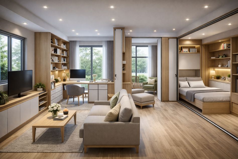 - Linh hoạt thay đổi công năng theo nhu cầu: Thiết kế nội thất thông minh như vách ngăn di động, giường gấp, tủ âm tường giúp không gian dễ dàng thay đổi theo từng giai đoạn cuộc sống.